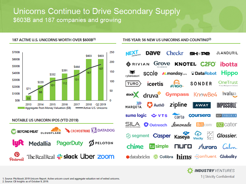 We believe the secondary direct market’s supply of shares is primarily driven by the combination of venture funded companies staying private longer and also by the growth in valuations (i.e. the number of unicorns – companies with $1B+ of enterprise value). There are currently over 187 unicorns with an estimated aggregate valuation of $600 billion[iii].