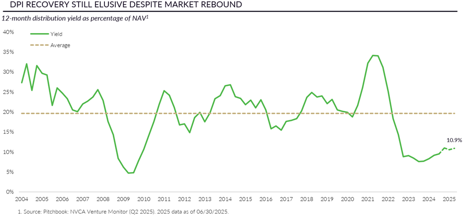 Additionally, fundraising challenges further heighten the urgency to harvest. In H1 2025, US VC funds raised $27 billion across 238 vehicles, with the median time to hold a final close extending to 15.3 months. This represents the longest fundraising period in a decade as LPs demand improved distribution pacing and greater asset‑level transparency.1 Slowed distributions are limiting capital recycling into new funds, which is further compounding the fundraising headwinds.