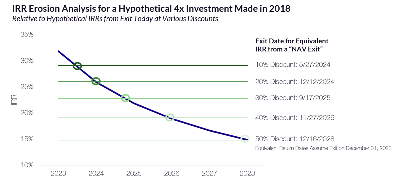 For the hypothetical 5-year-old investment held at a 4x return to an investor’s original cost basis, selling today at a 50% discount would generate a better return on a time-weighted basis than holding the position for another five years, assuming a NAV exit.
