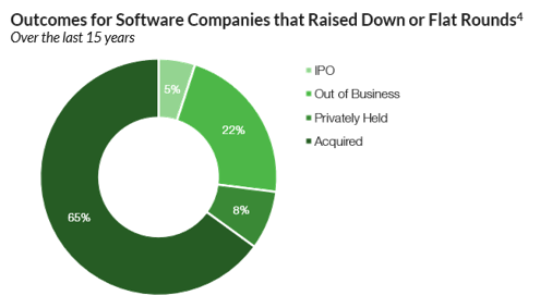 While raising a down or flat round extends a company’s lifespan and offers renewed hope, data suggests that it may not be the most prudent decision for investors. Over the last 15 years, 22% of companies that opted for down or flat rounds have gone out of business, 8% haven’t found liquidity, and just 5% have gone public. The remaining 65% have been acquired by strategics, buyout firms, or sponsor-backed strategics.4