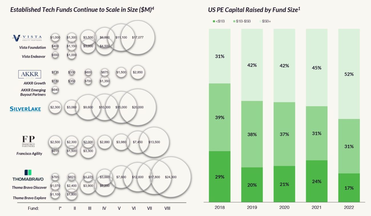 The tech buyout space becomes increasingly crowded with investor capital primarily flowing into larger funds and with mega tech buyout fund managers launching and scaling strategies targeting opportunities downstream from those targeted by flagship strategies – these include Francisco Partners’ Agility strategy, Thoma Bravo’s Explore strategy, and Vista Equity’s Endeavor strategy.