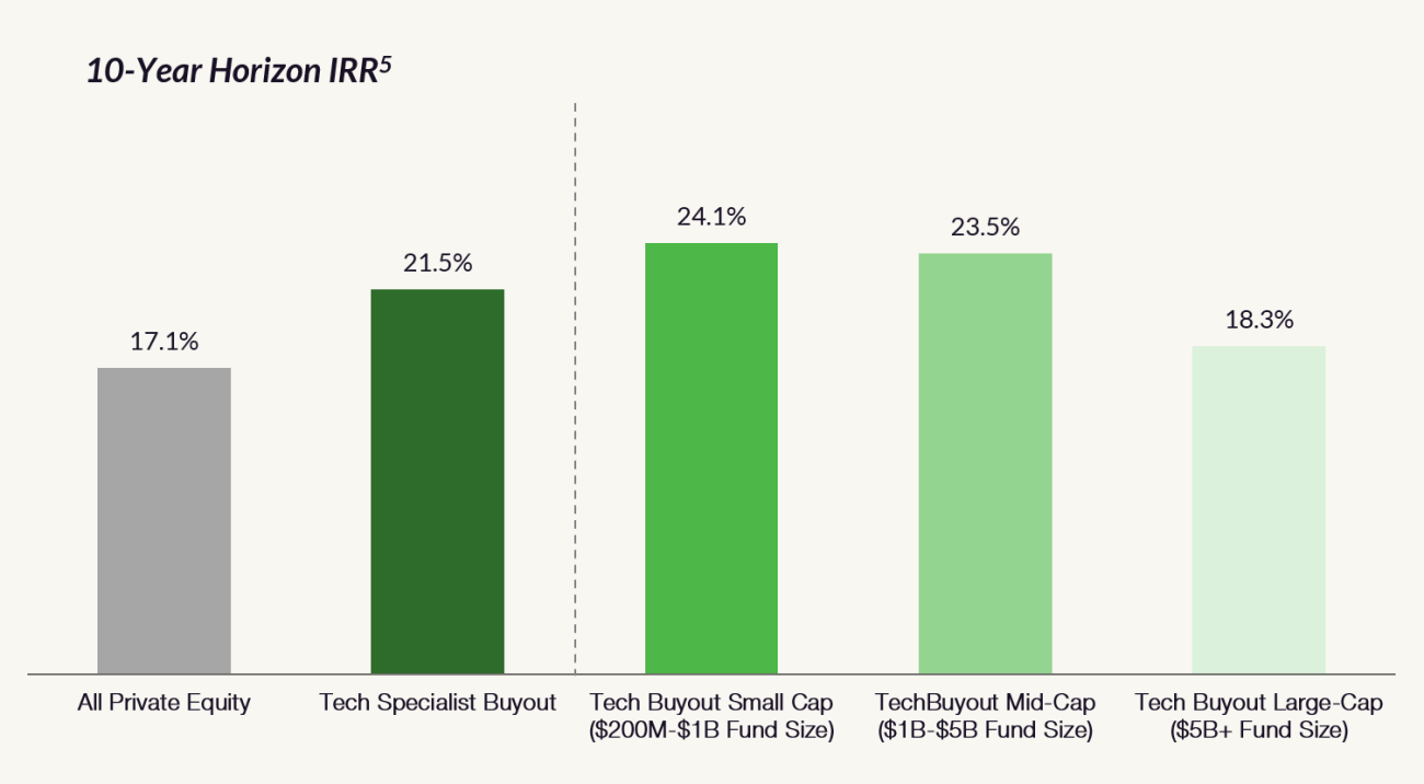 Within technology, outsized returns are actually most acute within the small-cap segment. Over a 10-year investment horizon ending in 2021, small-cap, technology-focused buyouts have outperformed the private equity industry as a whole by a whopping 700 basis points5. Further, small-cap, technology-focused firms outperformed all other size segments within technology buyout.