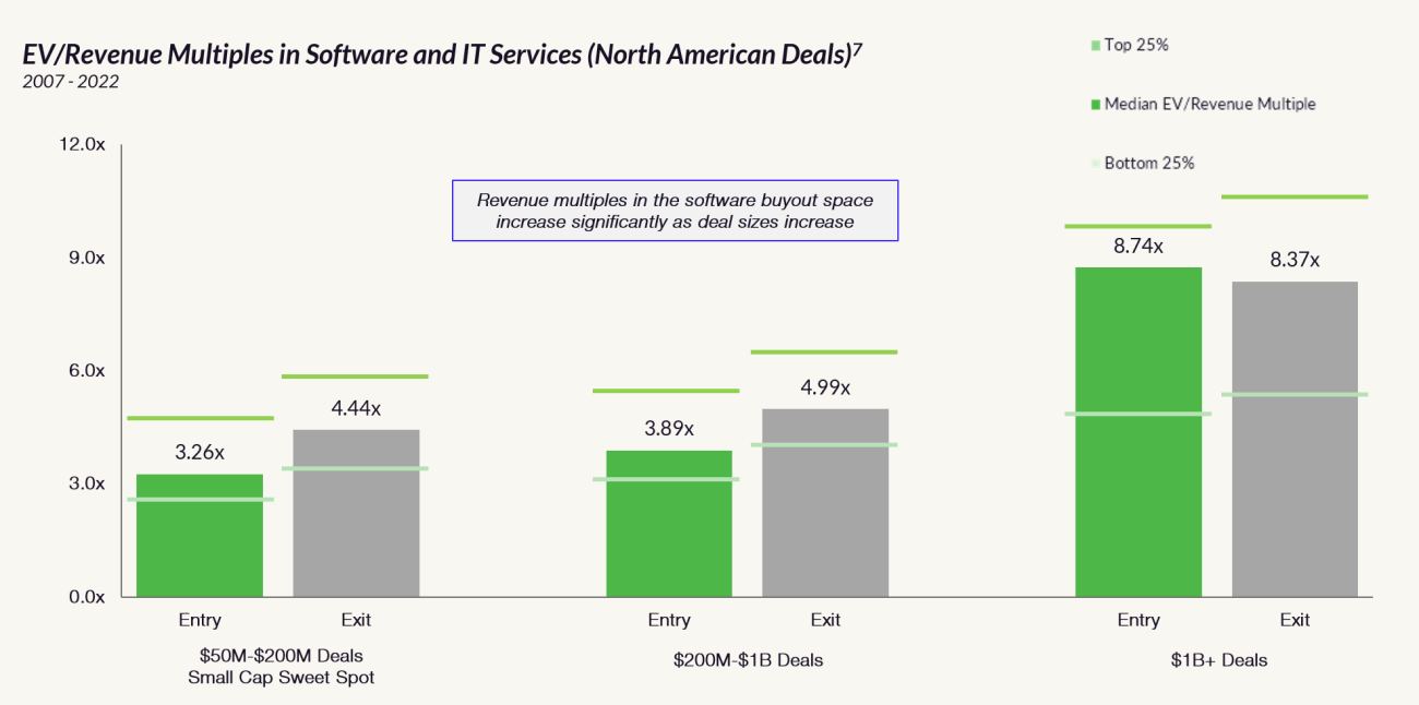 With limited private equity capital chasing this massive market opportunity, less competition creates notable valuation advantages, allowing small-cap managers to access deals at much more attractive entry values vs. their larger peers. When looking at the median software and services multiples over the past 15 years, there is a remarkable 5.4x turn delta between the small-cap deals ($50-$200M equity investments) and the mega-fund deals ($1B+ equity investments).