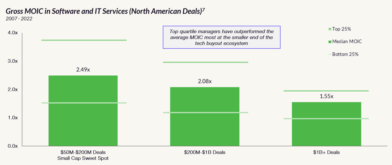 There is a broad appeal to these smaller companies as they reach scale, and with significant capital chasing fewer scaled opportunities, these companies are often exiting through highly competitive processes, furthering returns in the small-cap tech market. This is exhibited in the chart below where top quartile managers in the small end of the market are generating the best MOICs on transactions compared to their larger peers.