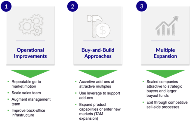 As we explored in depth in our earlier article “Private Equity Appetite for Venture Buyouts: A Look at Value Creation Post-VC,” small buyout funds can take advantage of market inefficiencies that can translate into strong returns. These inefficiencies allow small buyout managers to not only buy companies for attractive valuations but also pull on several different growth levers during the investment period including operational improvements and accretive add-ons that help them scale meaningfully and benefit from multiple expansion. An array of well-funded and acquisitive buyers at the larger end of the buyout market provides healthy exit pathways that creates the potential for strong returns.