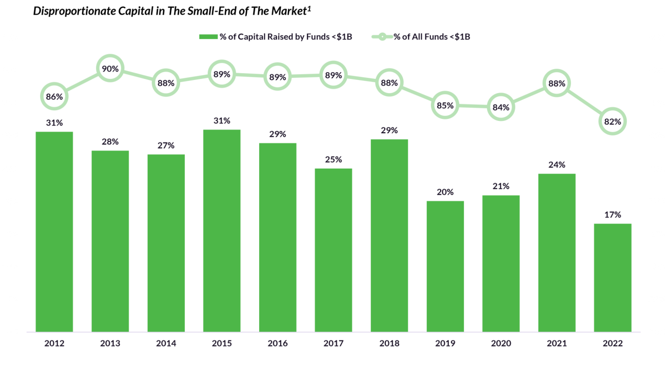 While the small-cap market represents a minimal amount of the total capital raised in buyout, this end of the market actually has more funds than any other segment within the buyout ecosystem, with over 3001 US PE funds less than $1B in size raised in 2022 alone, or 82%1 of all funds raised. With new emerging managers launching all the time, it creates significant noise and makes it difficult to discern who is differentiated.