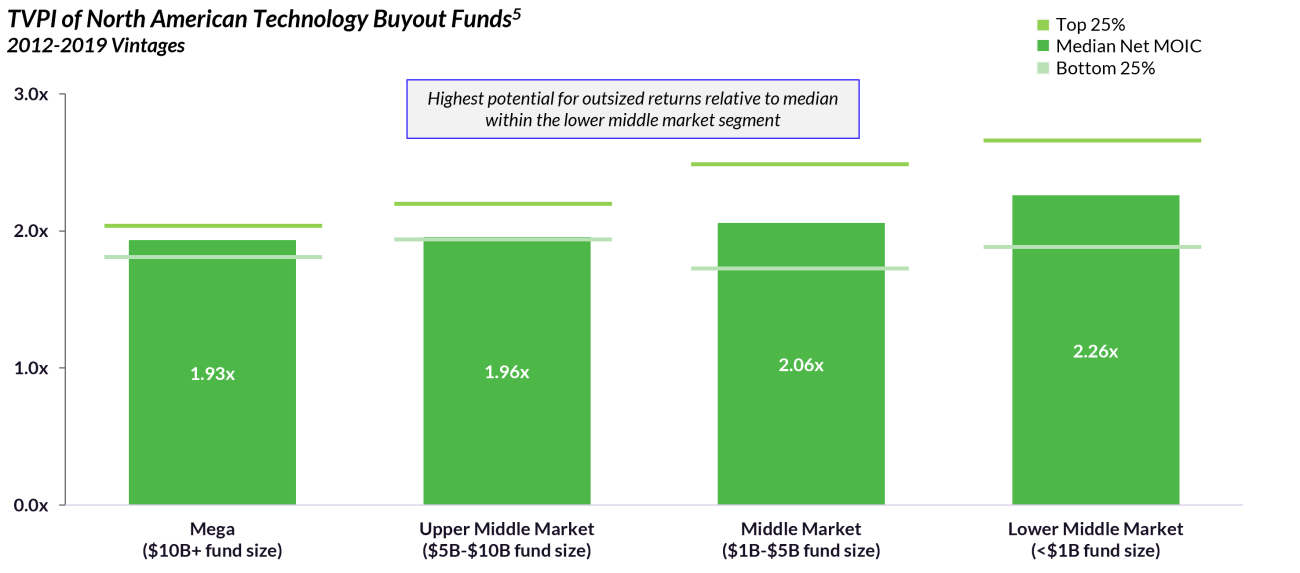 Identifying, accessing, and supporting top quartile managers within the small-cap ecosystem is the key to unlocking potential outsized returns in this end of the market. However, successfully navigating towards these top-tier managers requires a nuanced understanding of the relevant sectors/segments, a strong network, and creative capital solutions – all of which are foundational to our Industry Ventures Tech Buyout funds.