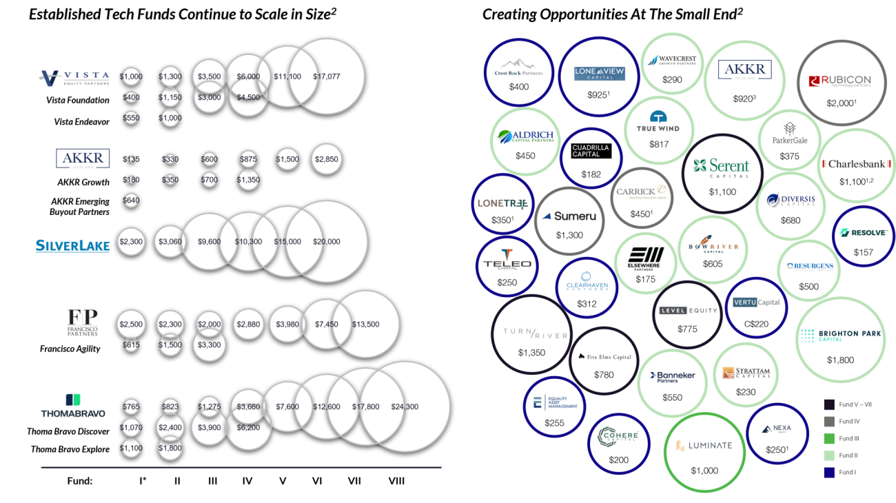 Over the next decade, we expect there will continue to be a growing number of tech buyout fund spinouts from larger established firms, capitalizing on opportunities down-market. This expanding set of small, specialist tech investors with fresh dry powder at their disposal can play a key part in a LP’s portfolio by providing complementary return drivers and portfolio diversification benefits. In order to obtain top quartile returns, one needs to overcome the challenges associated with diligencing and accessing this segment of the market. A deep understanding of the sector, broad awareness of small-cap segment participants, and a differentiated diligence angle will all serve to maximize the potential of achieving outsized returns. Additionally, careful portfolio construction across primary fund commitments, secondaries, and direct co-investments is necessary to optimize the risk profile associated with such returns.