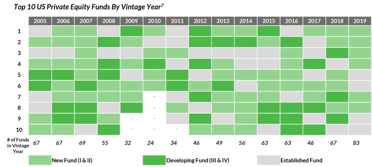 Private equity manager selection has also become more complex over time, increasing the importance of a disciplined process. From 2011 to 2021, 70.9%6 of capital went to experienced managers. Through Q3 2022, private capital fundraising totaled $926.4B6, but $785.9B6 (or 84.8%6) went to 9596 experienced managers, while the remaining $140.6B6 went to 8886 emerging firms6. Despite that, in the chart below, we see that emerging managers actually represent over 50%7 of the top 10 best-performing PE funds within any given vintage. While identifying these funds is challenging, if done correctly it can generate best-in-class returns.