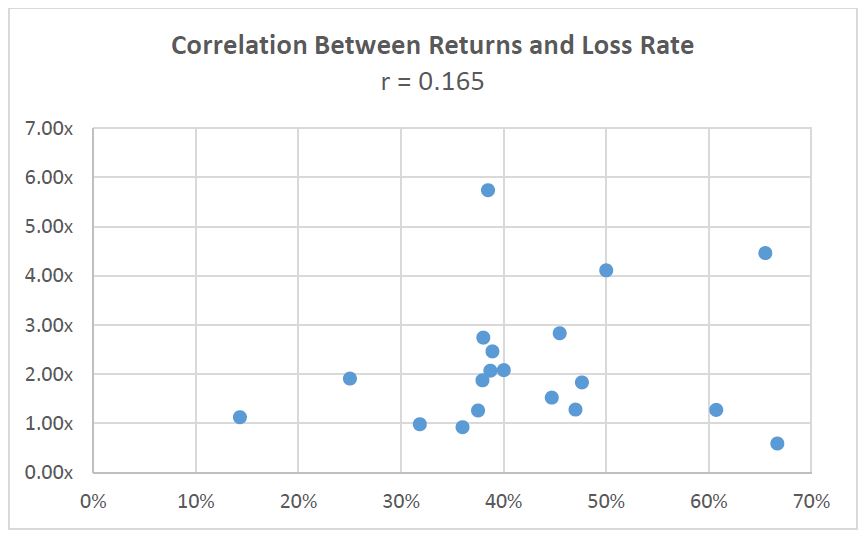 Admittedly, there was an element of dispersion in our results (see correlation chart below). In the case of two top performers, for example, “Fund A,” a 2007 vintage, had a 4.4x MOIC and a 66% loss rate, while “Fund B,” a 2008 vintage, had a 5.8x MOIC and a 38% loss rate.