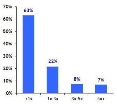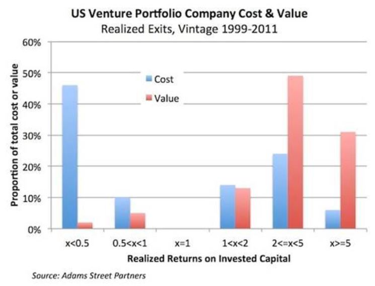 To see if our hypothesis was on target, we compared our results to those reported by others, including Adams Street Partners. They concluded that 55% of invested capital was allocated to losing deals, with a capital-weighted loss rate of 45%.